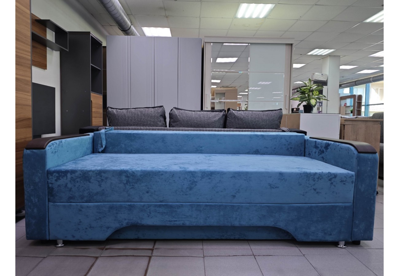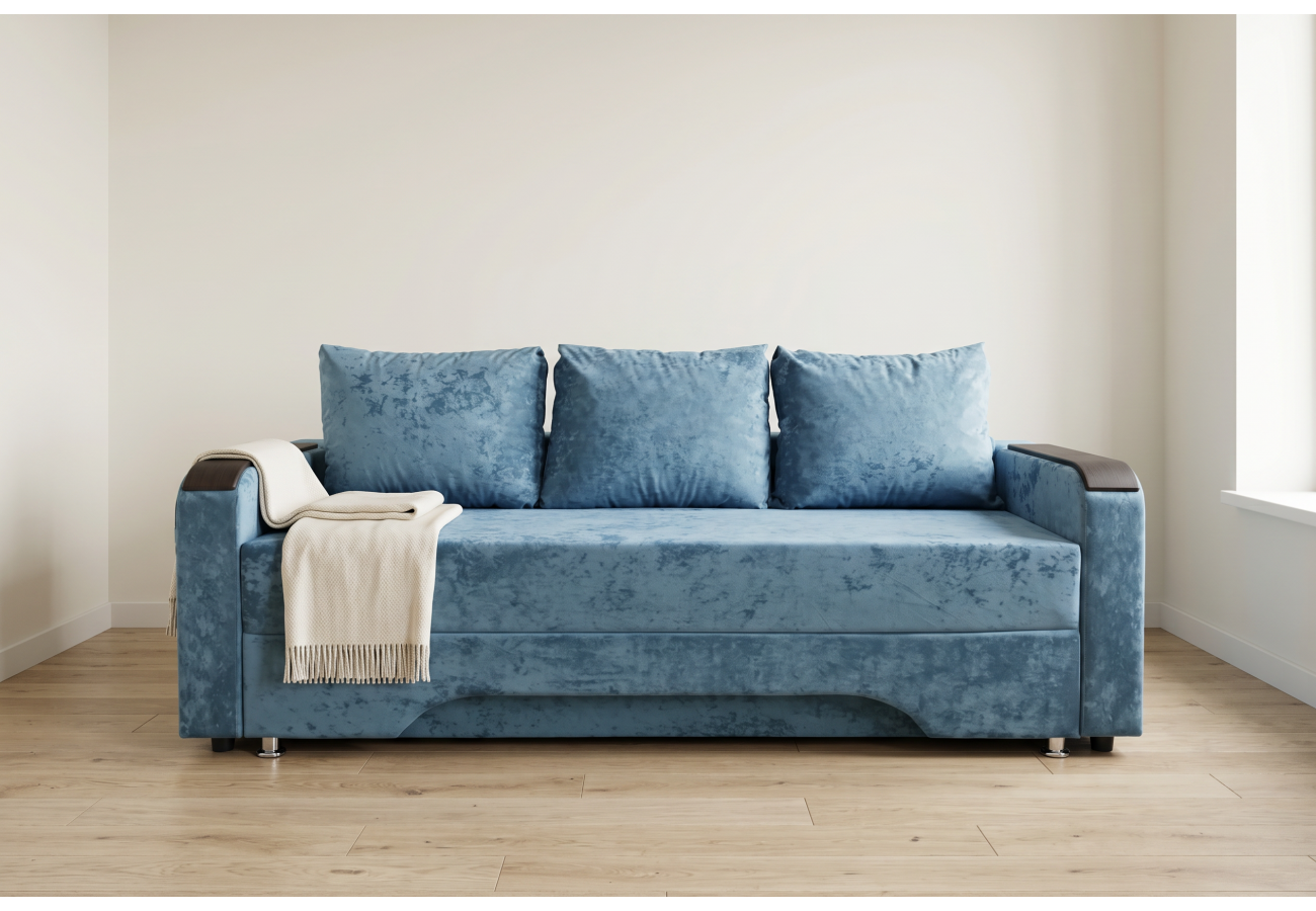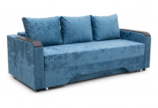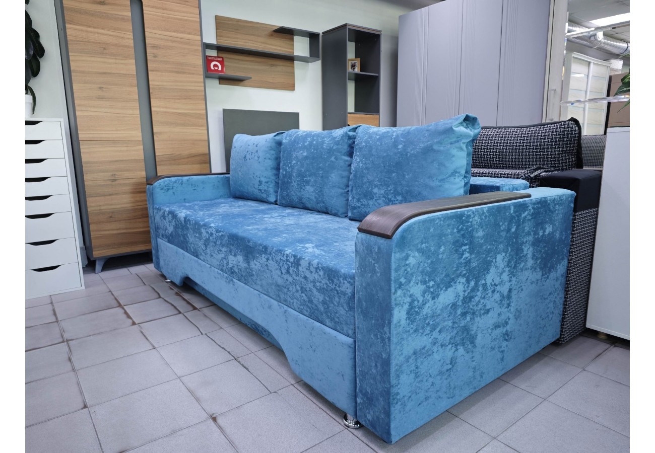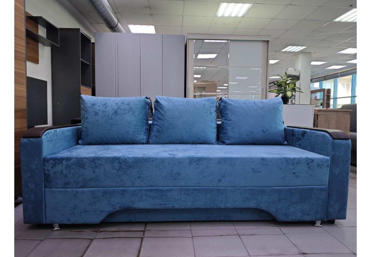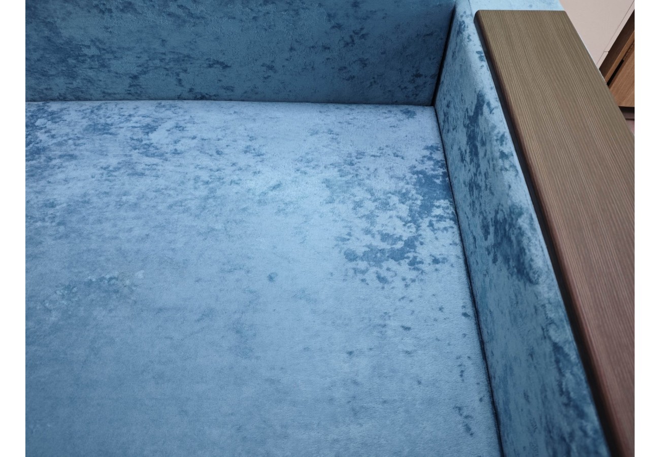 Размер дивана — 220 х 100 х 75 см, спальное место — 140 х 190 см. Обивка выполнена из велюра. Для хранения предусмотрен бельевой ящик.