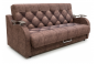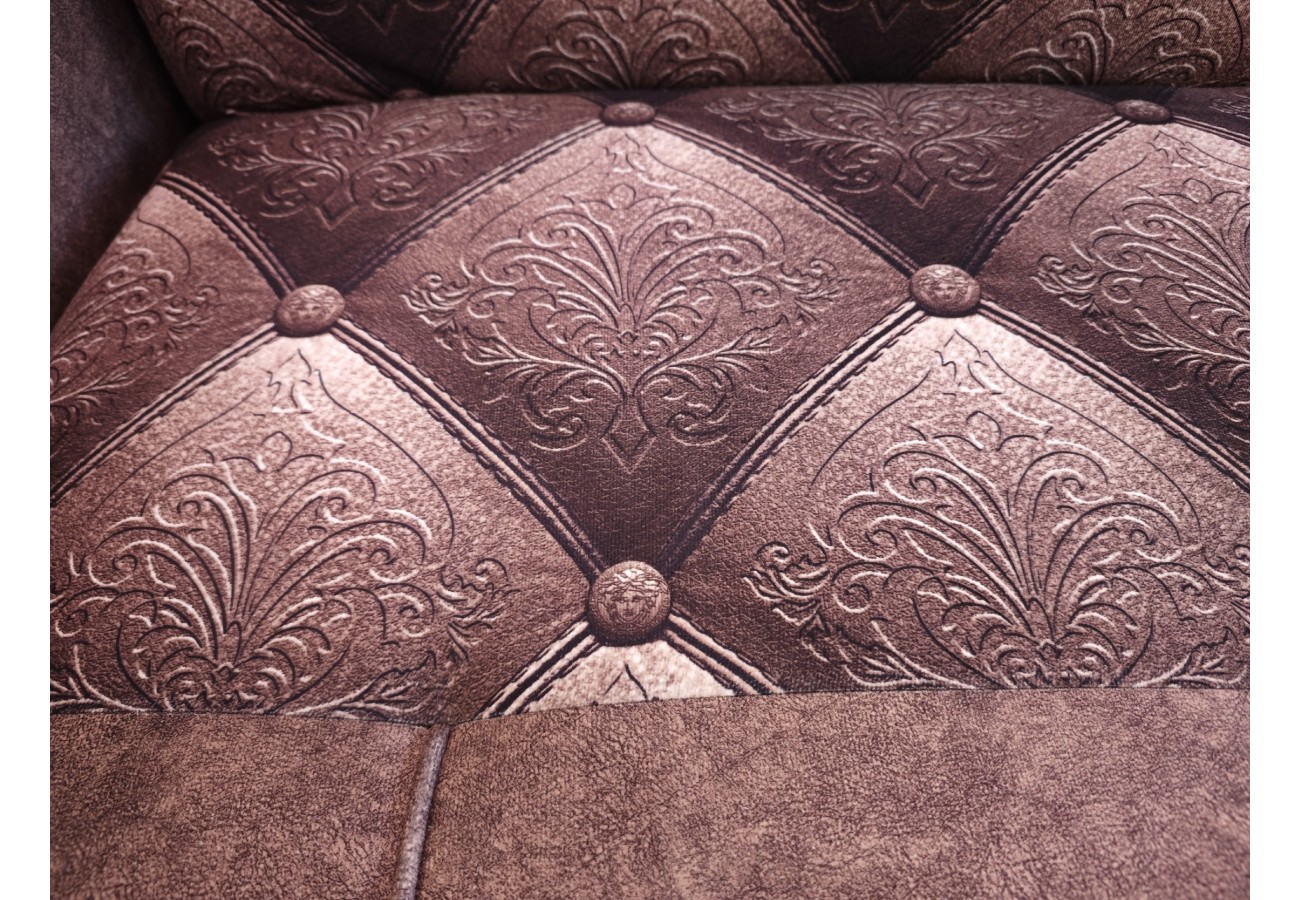 Модель выполнена в коричневой гамме и дополнена декоративной каретной стяжкой на спинке и сиденье. Мягкие округлые подлокотники и накладки сверху подчеркивают выразительный классический облик дивана.