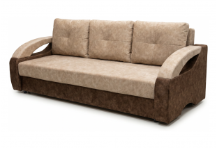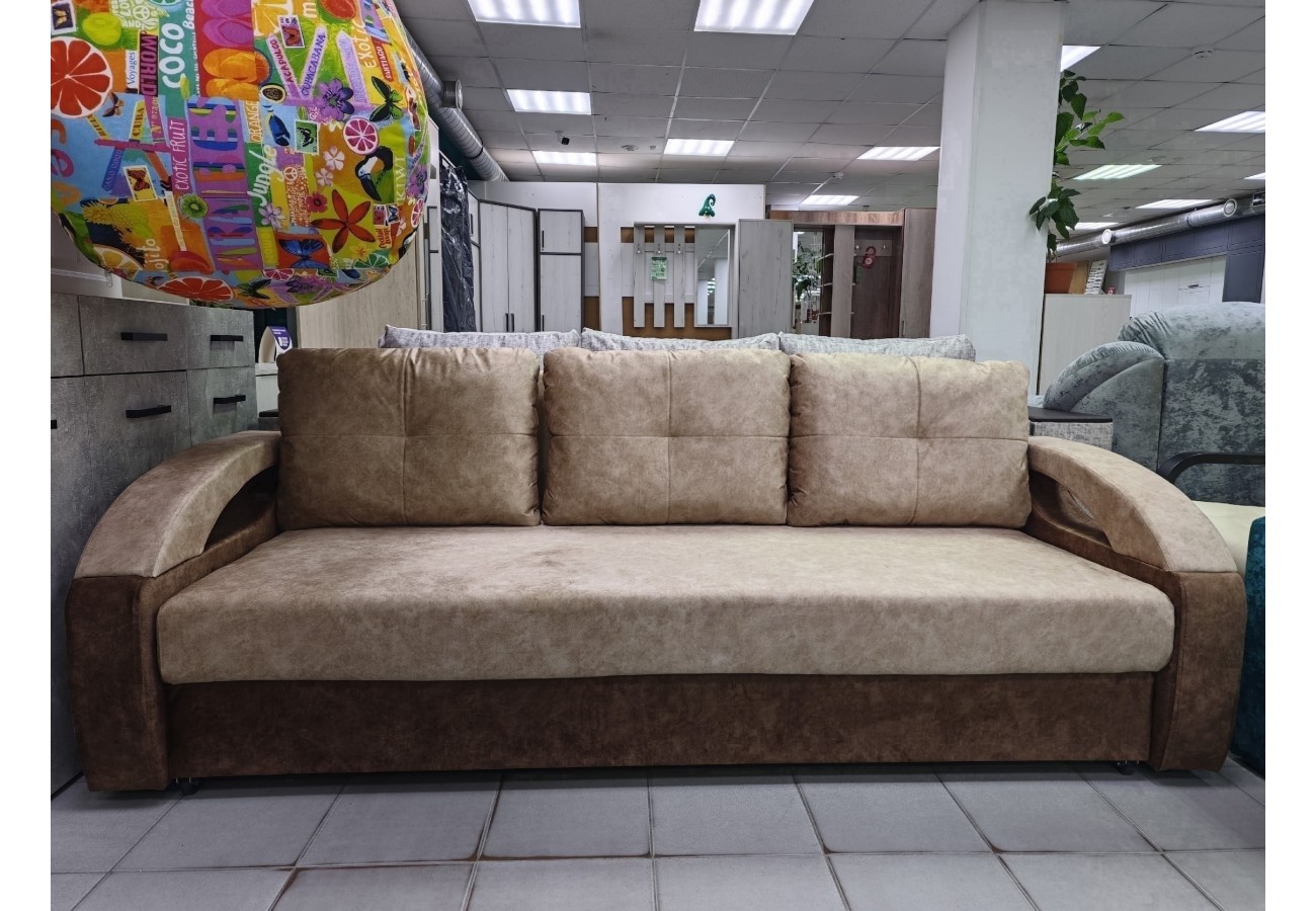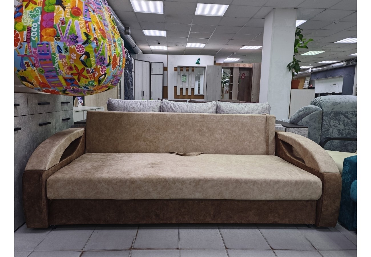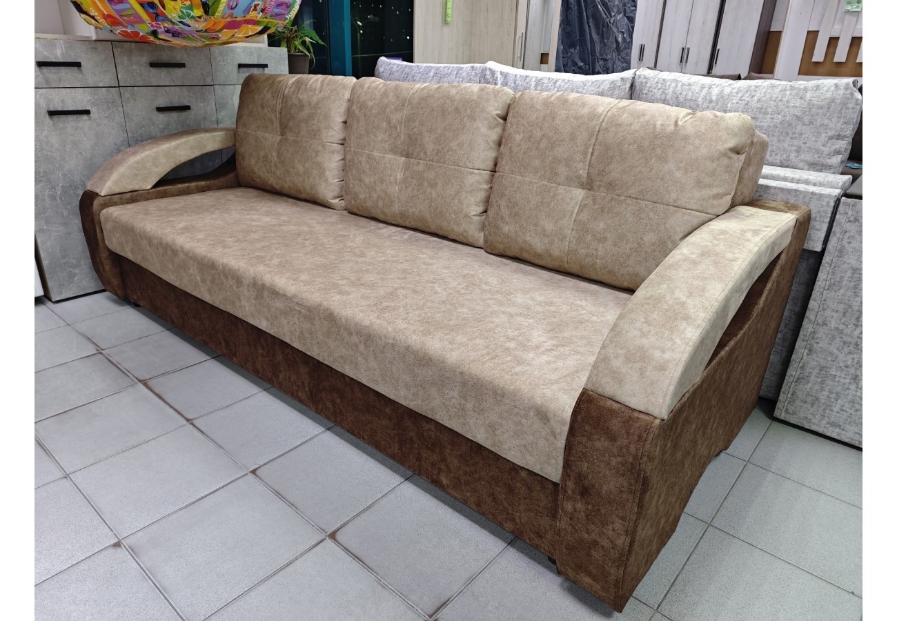 Обивка из велюра приятна на ощупь, а двухцветное исполнение в шоколадно-бежевой гамме делает диван выразительным в интерьере. В комплект входят подушки, предусмотрены подлокотники и бельевой ящик.