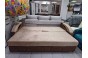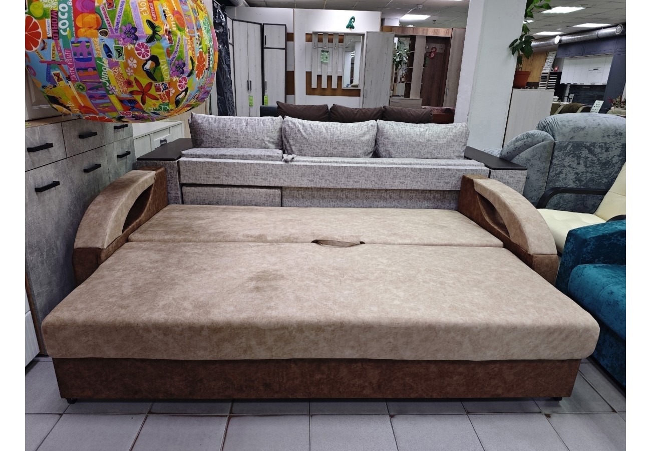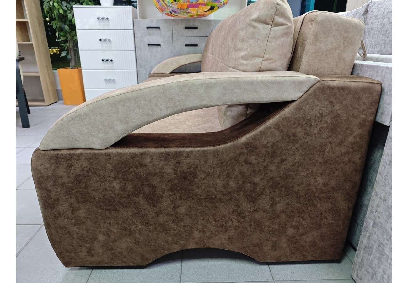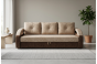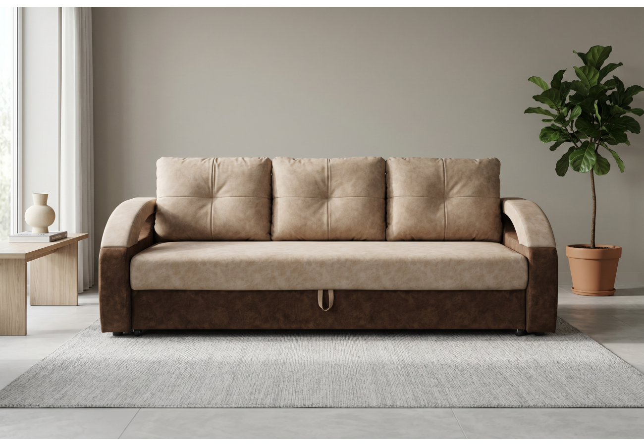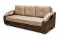 Обивка из велюра приятна на ощупь, а двухцветное исполнение в шоколадно-бежевой гамме делает диван выразительным в интерьере. В комплект входят подушки, предусмотрены подлокотники и бельевой ящик.
