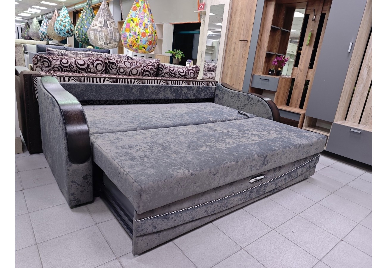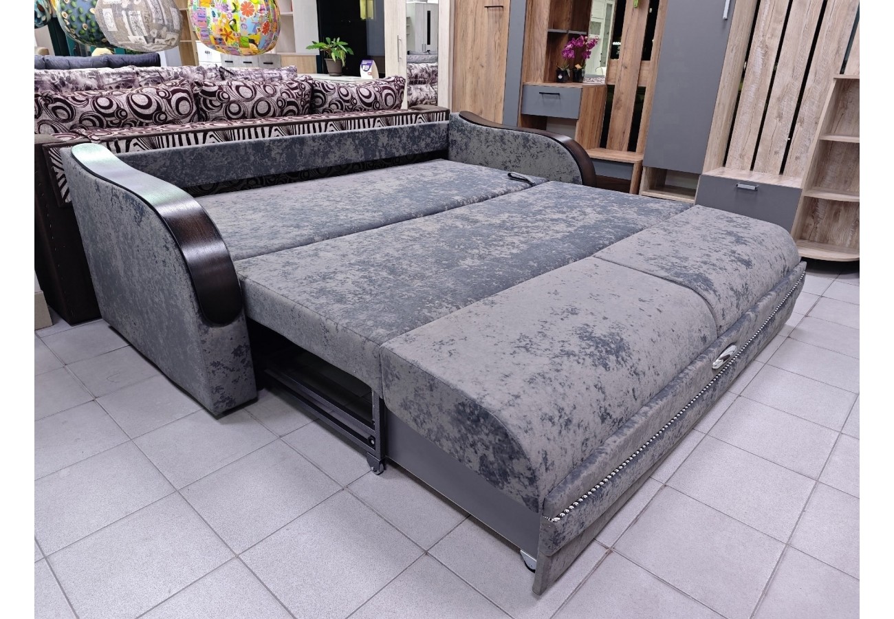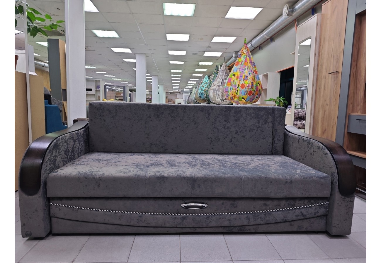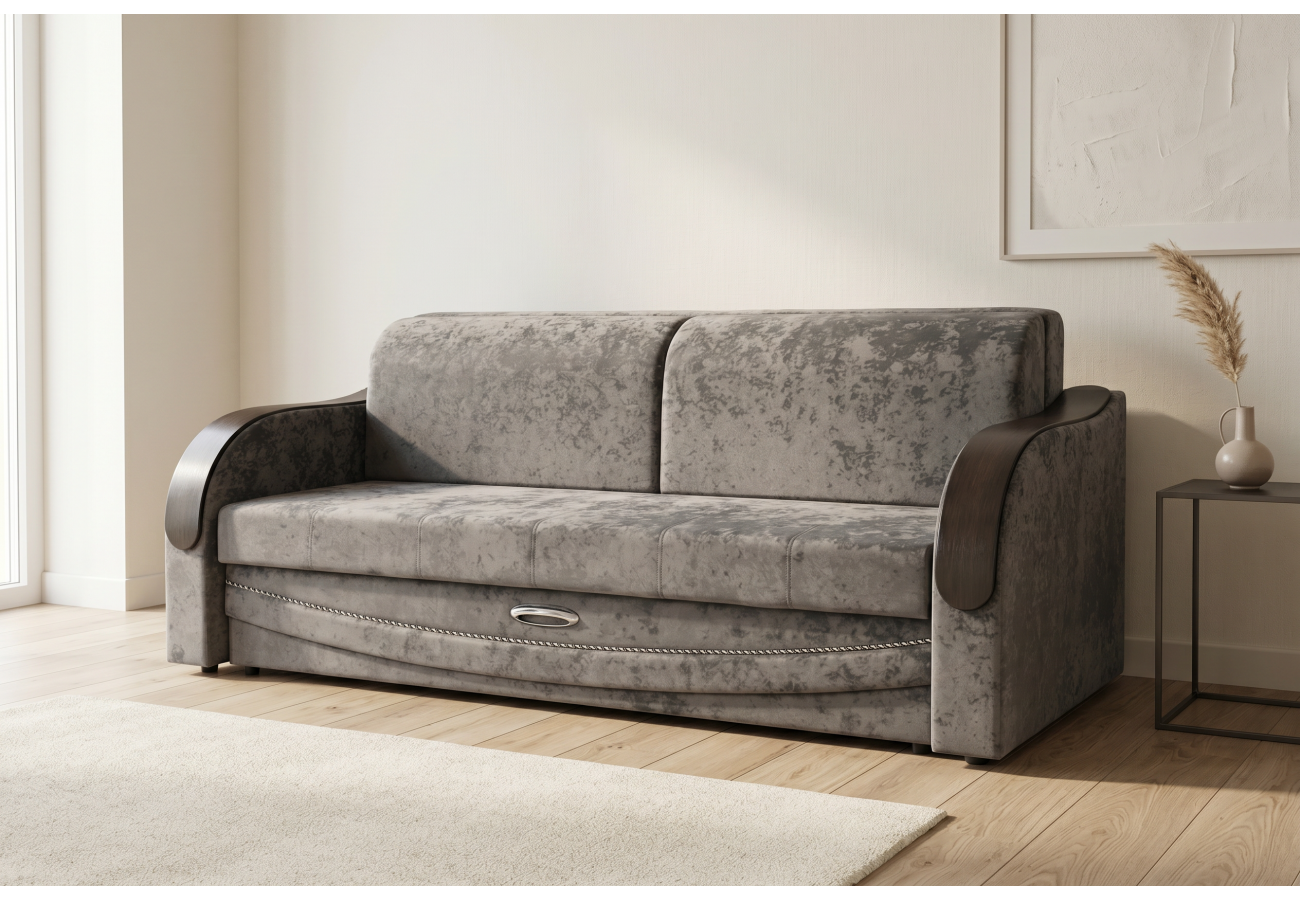 Прямой диван «Лидер-2» подходит для гостиной и ежедневного использования как раскладное спальное место. Модель выполнена в сером велюре, дополнена плавными подлокотниками с темной декоративной накладкой и выкатным механизмом трансформации.