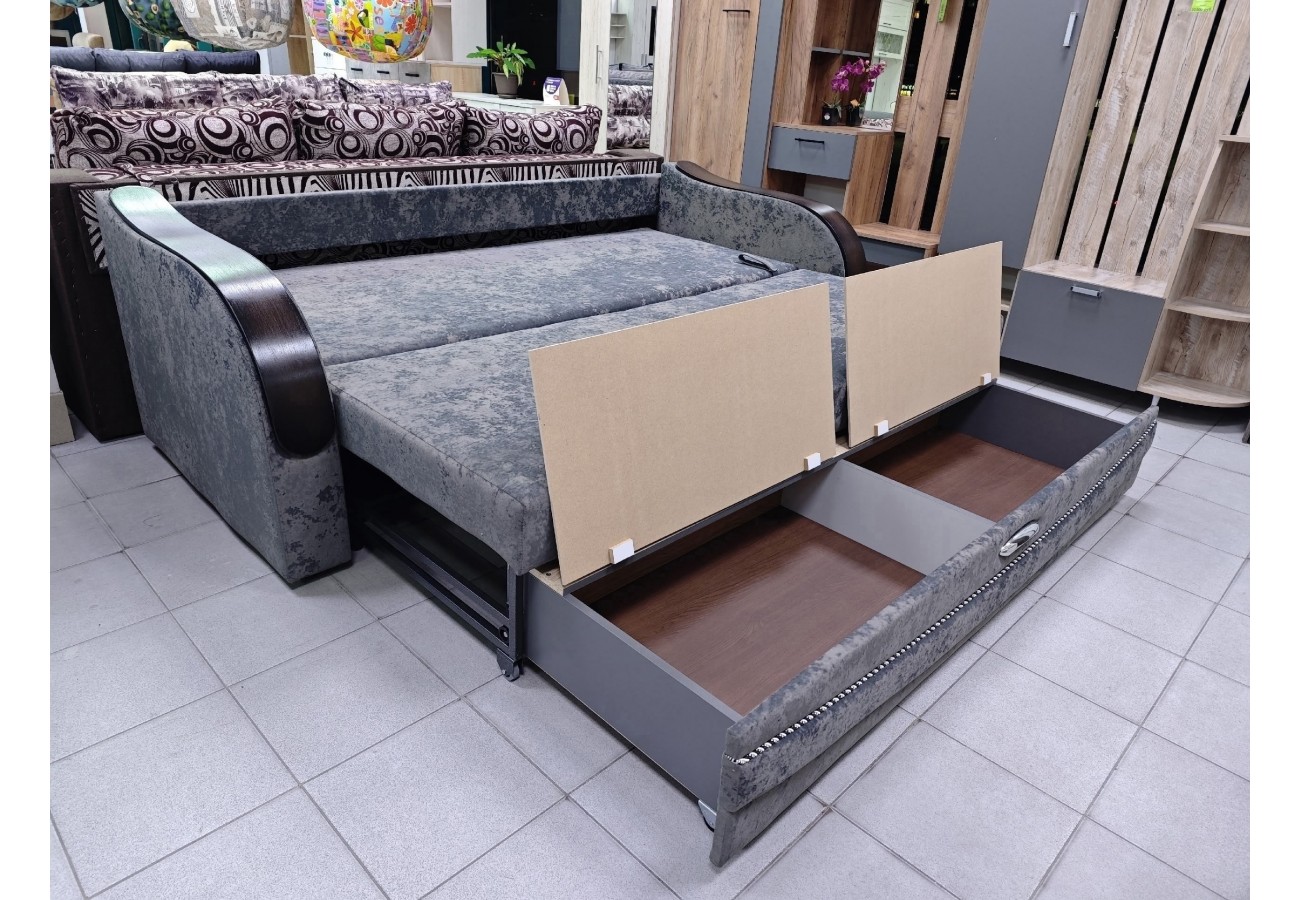 Основа корпуса — прочный металлокаркас. Наполнение выполнено из поролона повышенной плотности. Диван комплектуется подушками со съемным чехлом, а в конструкции предусмотрены два вместительных ящика для хранения постельного белья.