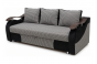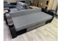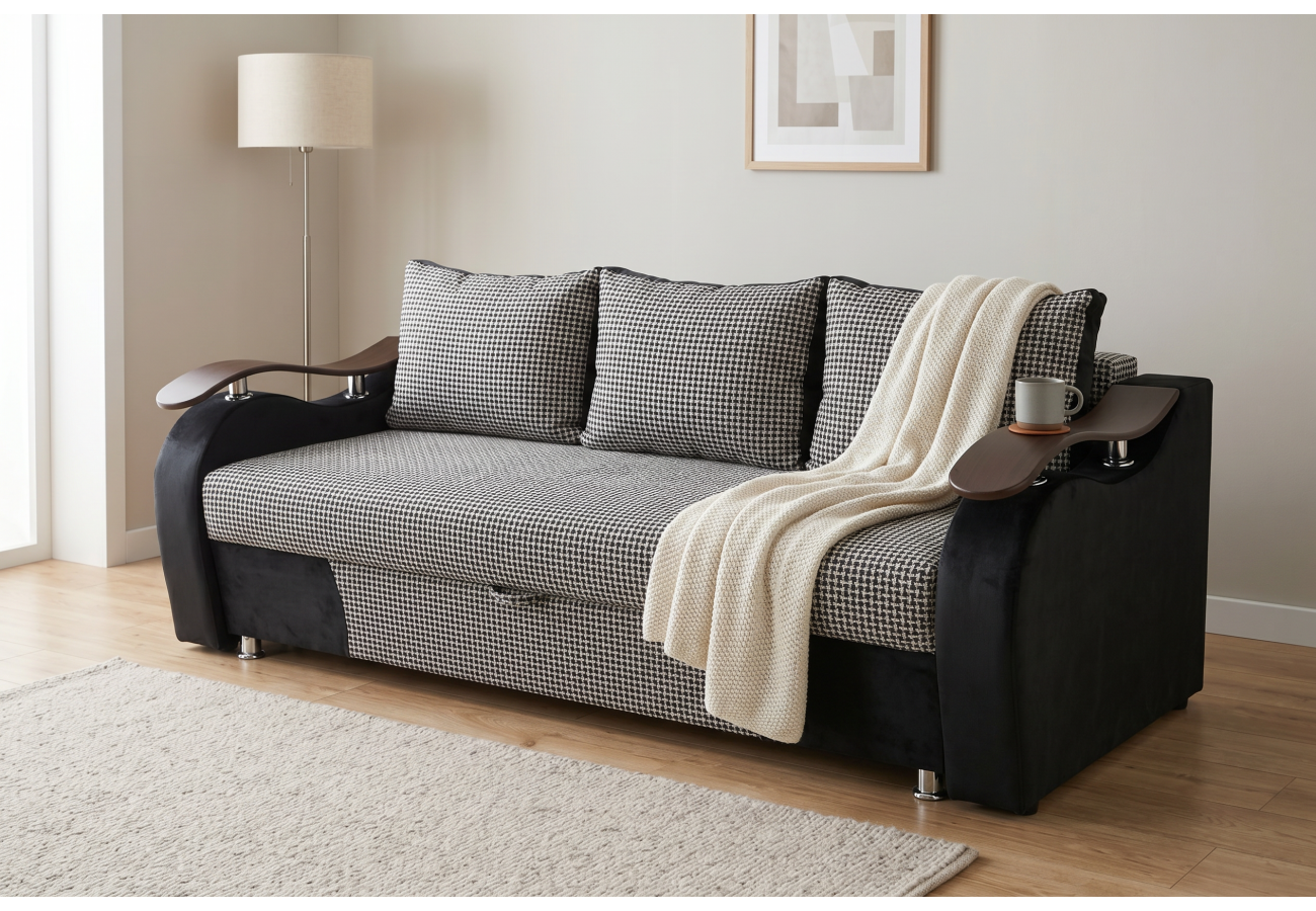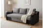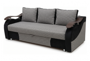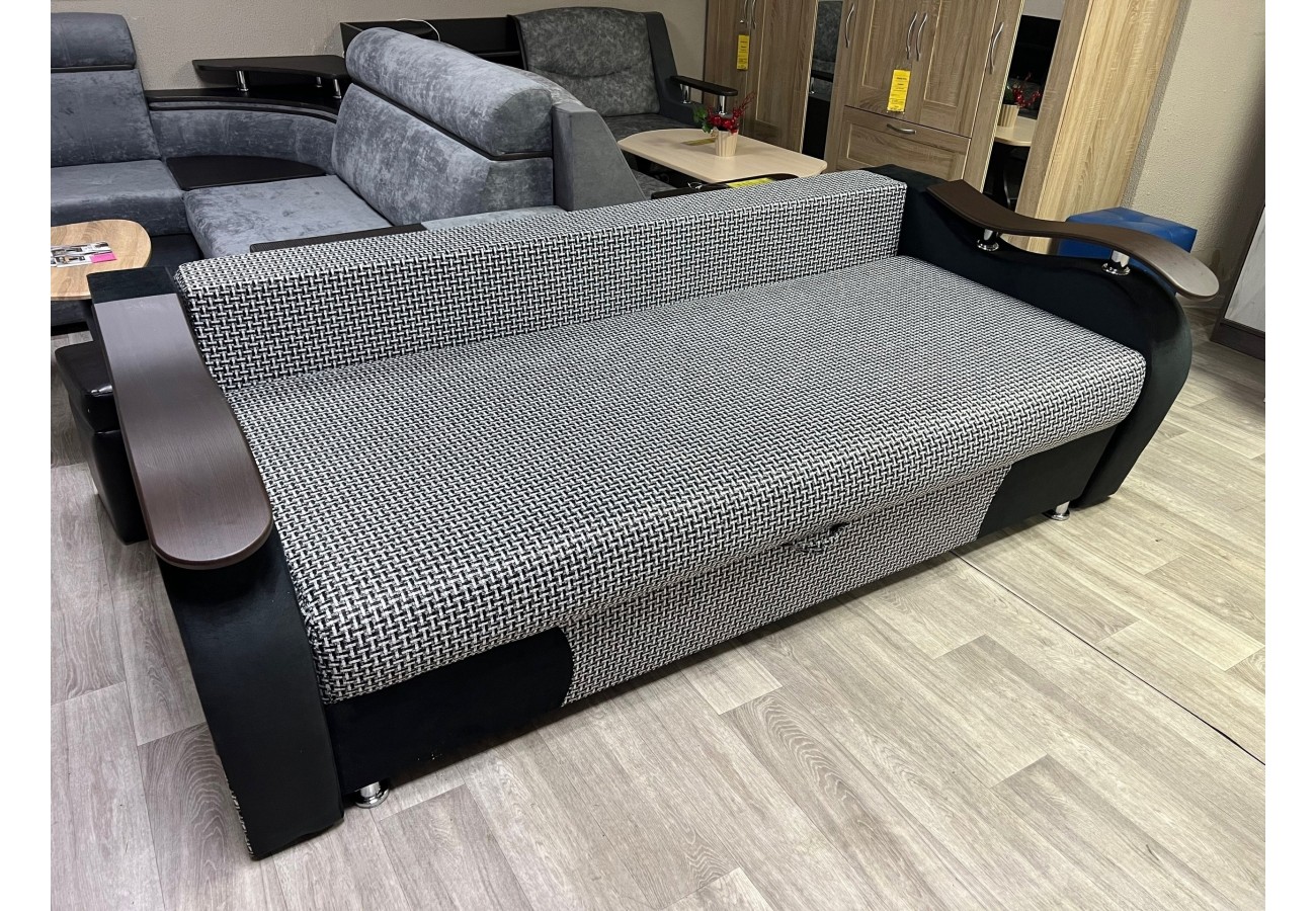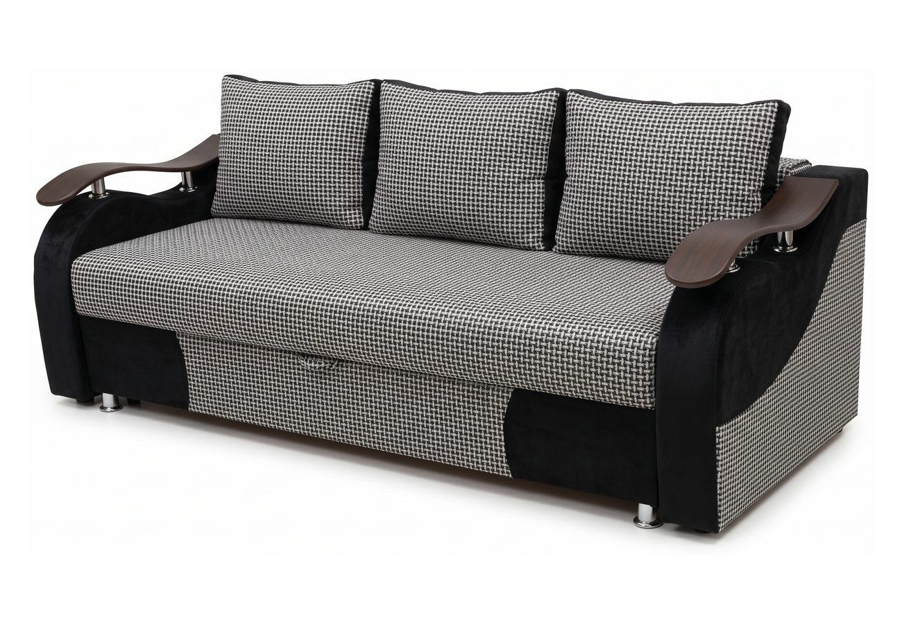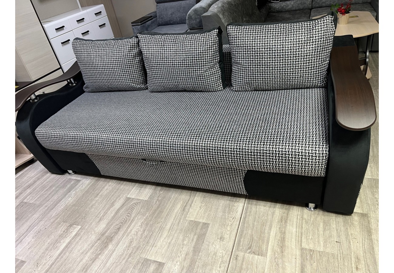 Диван раскладывается, в описании указан механизм трансформации пантограф/выкатной/еврокнижка. Внешне модель выполнена в серо-чёрной гамме, с широкими подлокотниками, декоративными накладками и подушками в комплекте.
