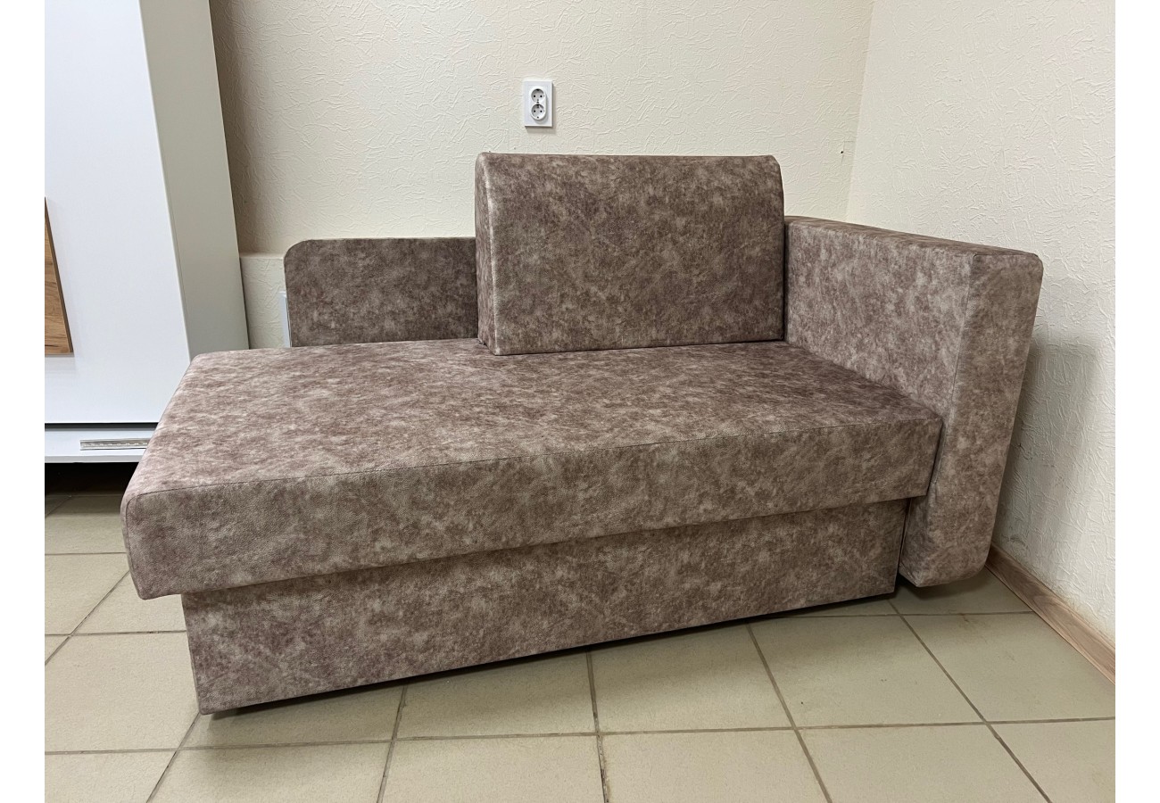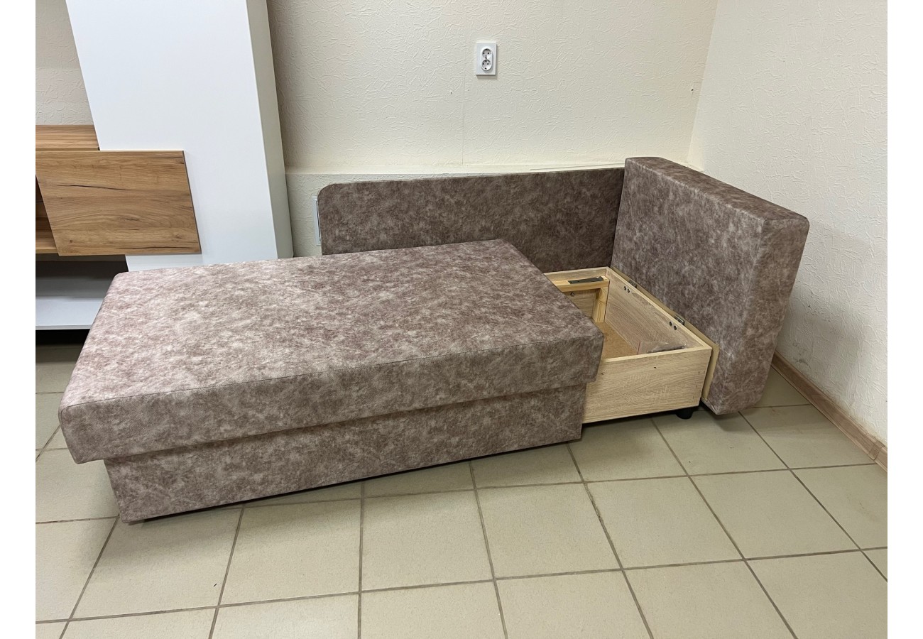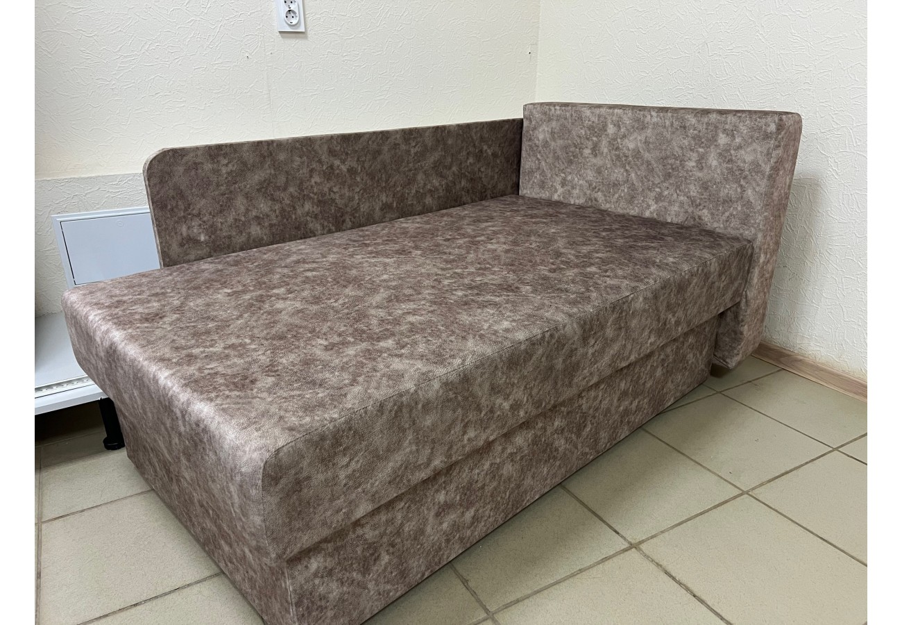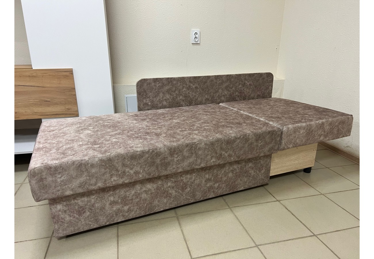 Диван выполнен в обивке из велюра коричневого цвета. Размер составляет 147 х 79 х 89 см, спальное место — 75 х 193 см. Механизм трансформации — еврокнижка, предусмотрен бельевой ящик.