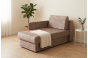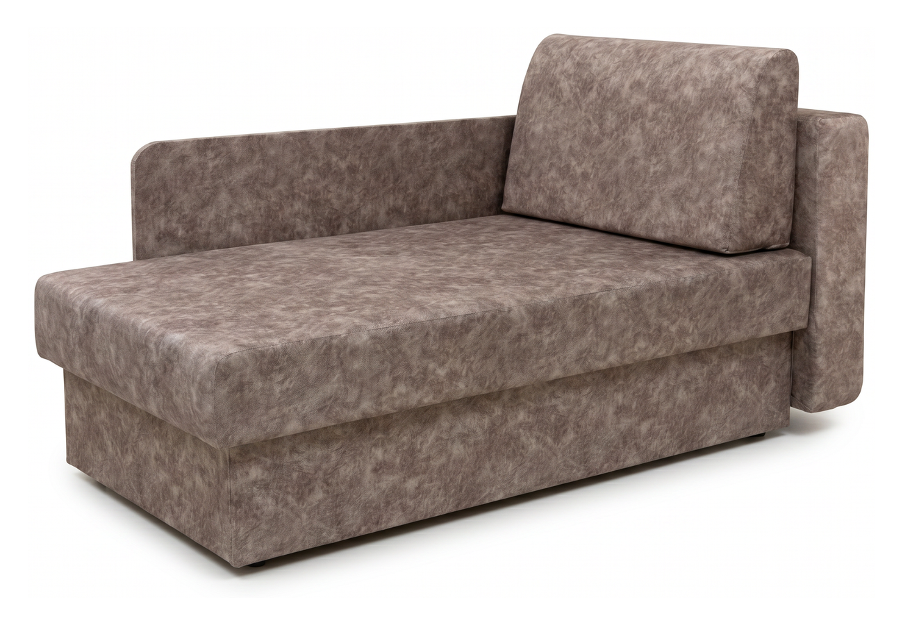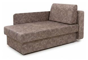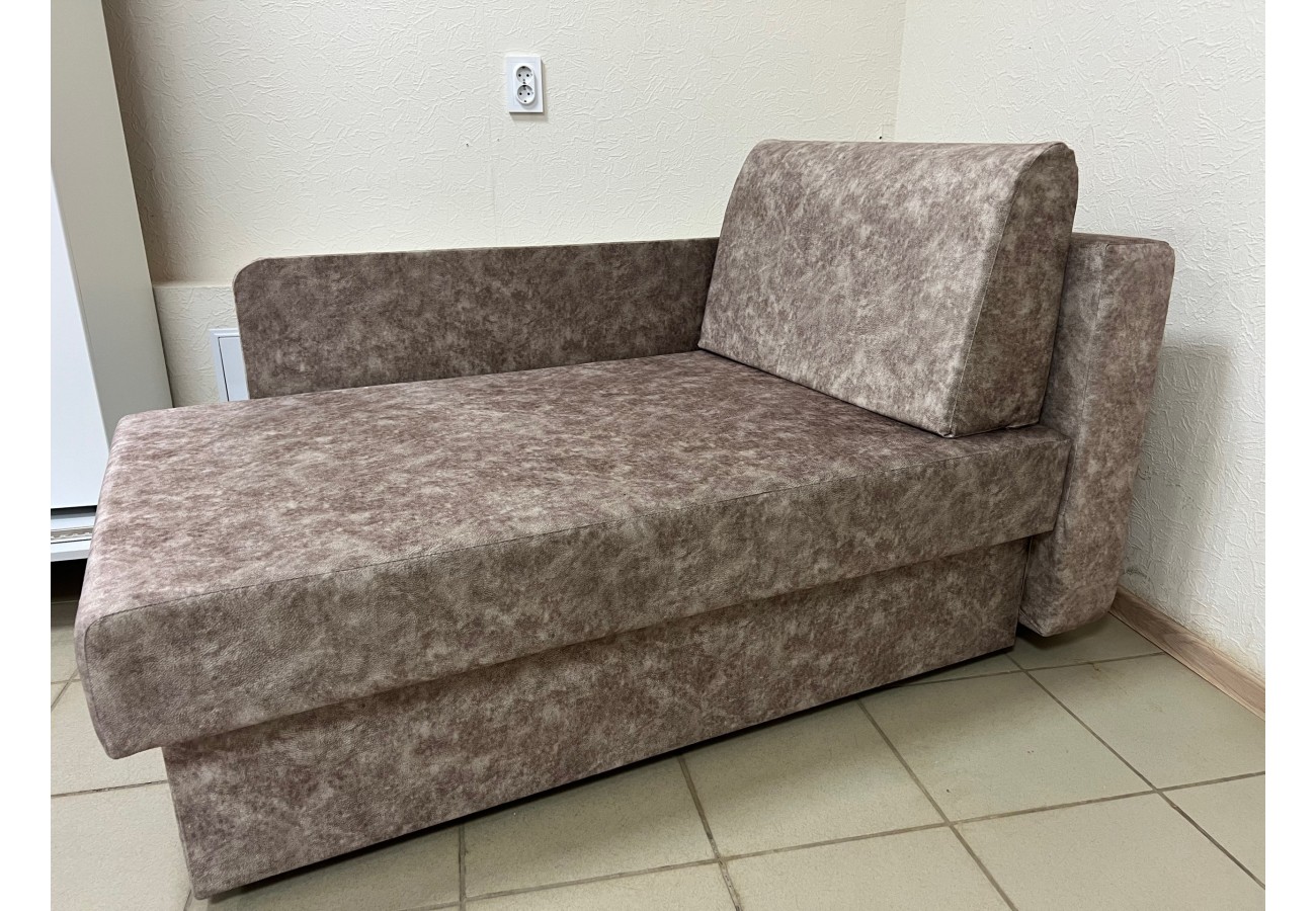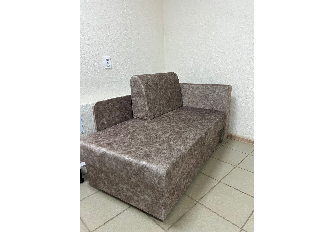 Диван выполнен в обивке из велюра коричневого цвета. Размер составляет 147 х 79 х 89 см, спальное место — 75 х 193 см. Механизм трансформации — еврокнижка, предусмотрен бельевой ящик.