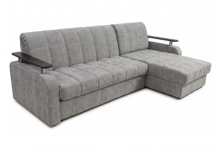 Диван выполнен в современном стиле, в светло-серой обивке. У модели есть оттоманка, мягкие широкие подлокотники и декоративные накладки цвета венге.